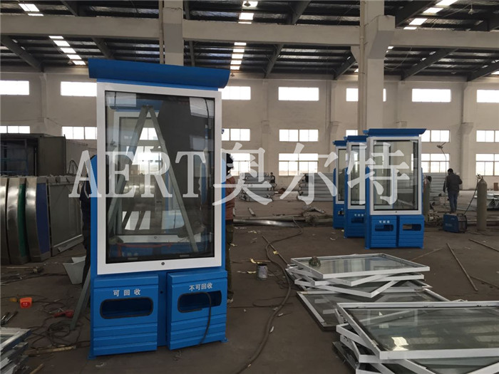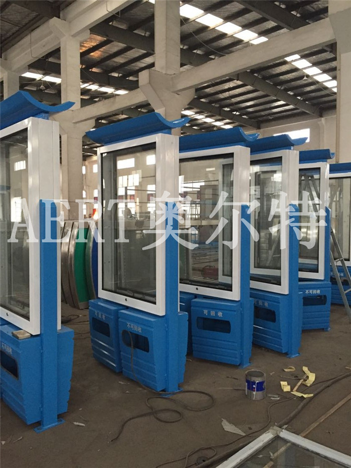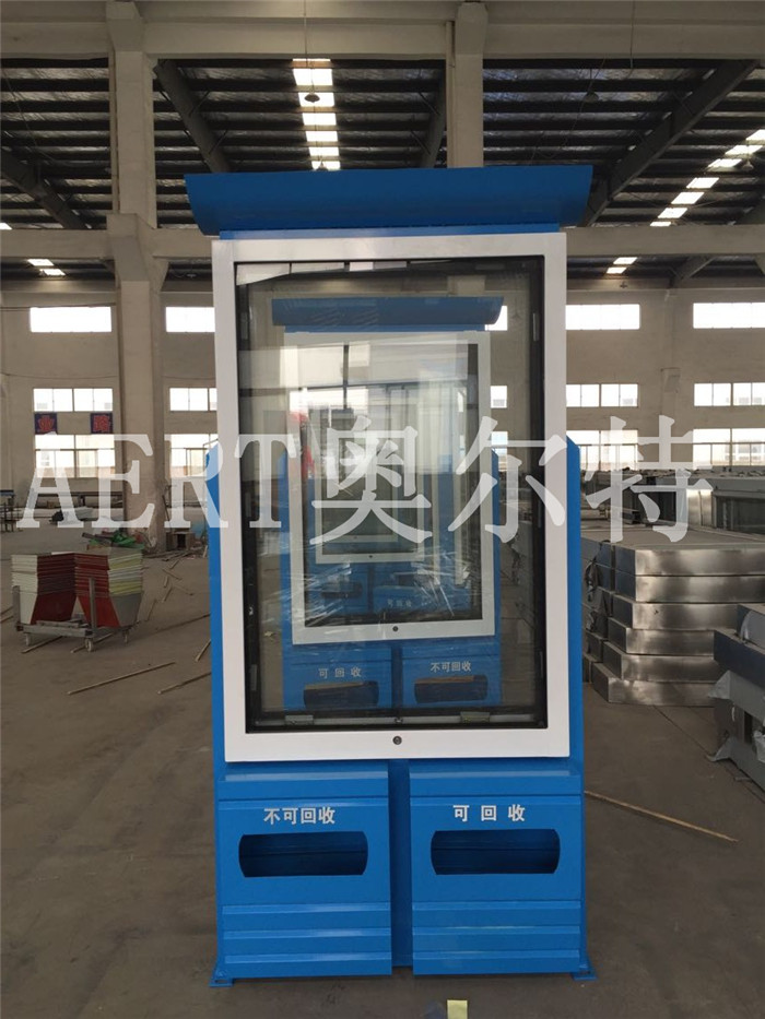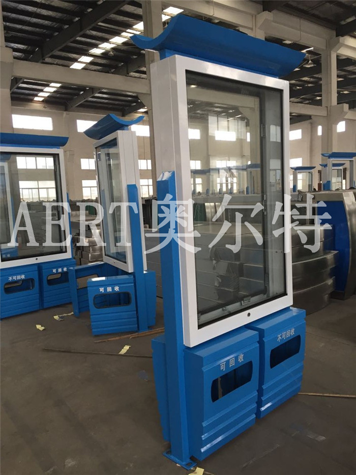 2、箱体和底座连体式设计,结构牢靠,底座可固定地上,抗打击,抗风力。独特的抽屉式斜插内桶,可实现直抽直插,自动归位,使垃圾的清理过程缩短,降低了环卫工人的劳动强度,也减少了政府人力资源的配备。投入口与清理口合二为一,投入口为喇叭形,便于垃圾入箱,解决了城市美容箱长期未能解决的垃圾溢出问题。垃圾投入口处于半封闭式状态,遮阳避雨,减少了垃圾异味的散发而污染环境。压条装饰设计,更换广告画面简单,维修方便、快捷。