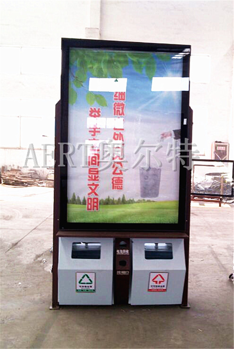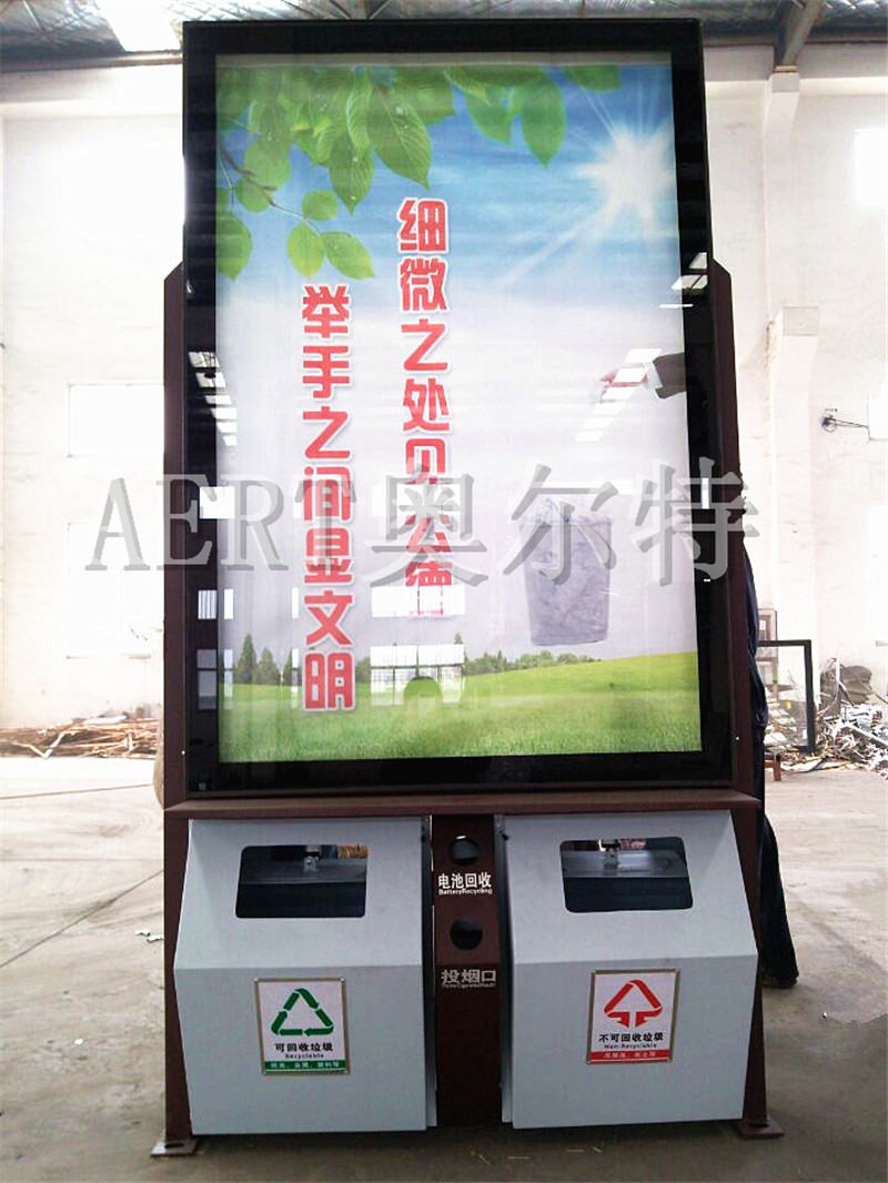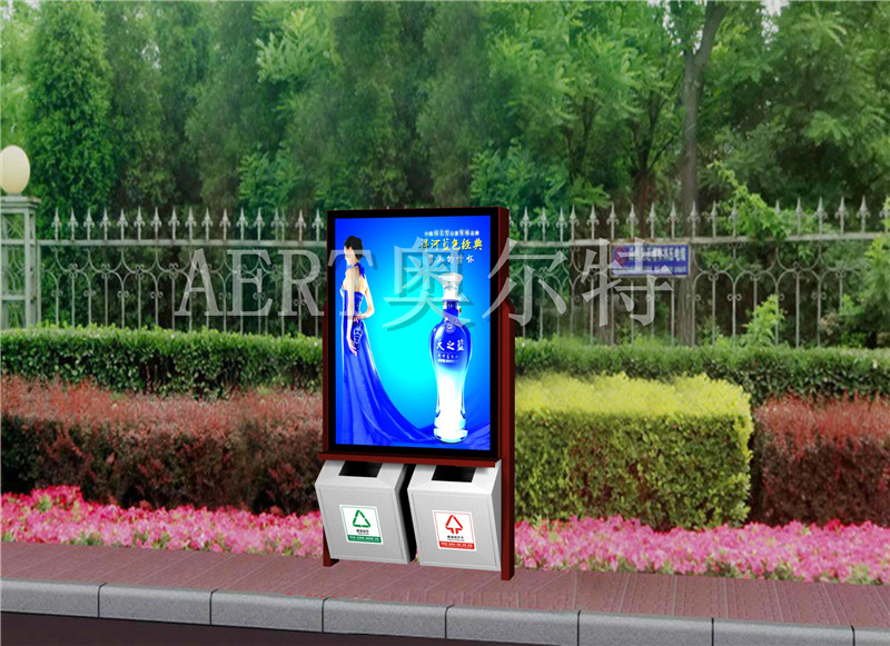 广告垃圾箱产品主要有不锈钢、钢板烤漆喷塑等材质。下部为垃圾箱部分,分可回收和不可回收垃圾两个垃圾收集桶,上部为换画广告机,容纳2-9幅广告画面,顶端可加装LED显示功能(滚动显示客户宣传信息),该产品主要投放繁华地段,固定画面灯箱垃圾箱适合普通路边投放,滚动画面灯箱适合繁华路名投放。