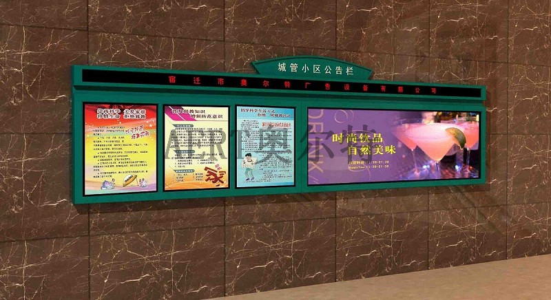 宿迁奥尔特是宿迁市老牌灯箱生产厂家,客户询一般型号当天答复,遵循“当天的问题当天解决”的原则,公司的宗旨是以优质的产品、合理的价格、完善的服务赢得您的信任和支持!,画面更换,主要设有面向客户的研发部、生产部、组装部、质检部、销售服务部、市场部等部门,小区灯箱制作的开发_生产和销售的专业厂家。把握时代脉搏,经过不懈地努力,不断改进生产工艺,优化产品结构,强化产品检测方法,精选优质原材料,广泛吸纳高级管理、设计及技术人才,拥有技术研发中心、广告营销中心、网站运营中心、市场中心等七大职能体系,快速发货,践行“共同成长”的使命和“诚信、关爱”、“创造价值”的核心价值观,以“战胜自我”的企业精神,画面控制板包1年,我们推崇“科技创新、精益求精,用户满意、持续改进”的质量方针。