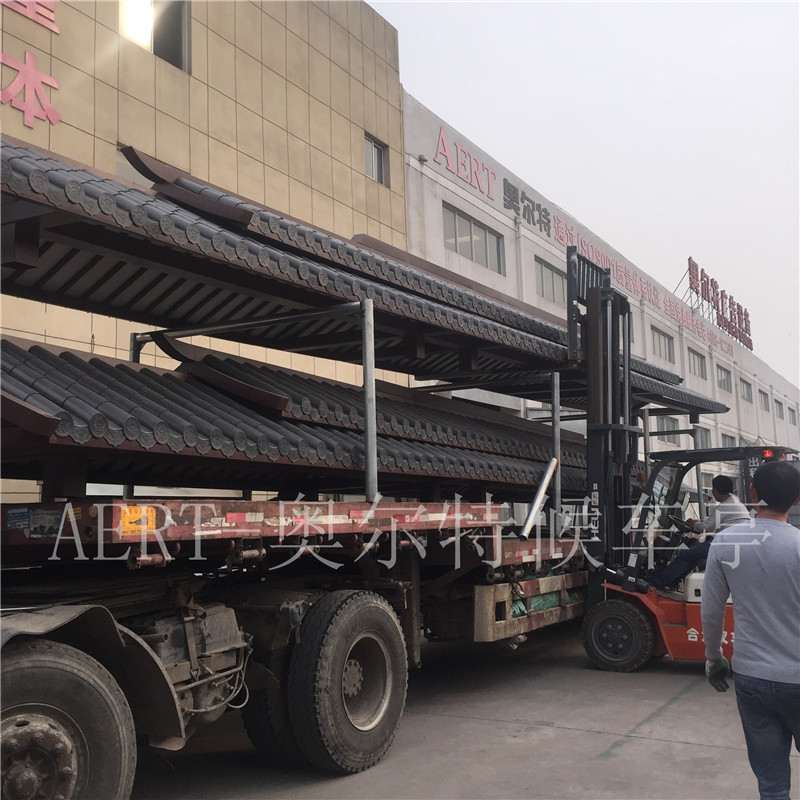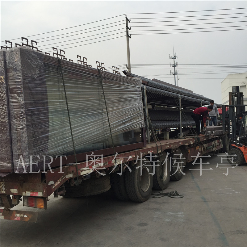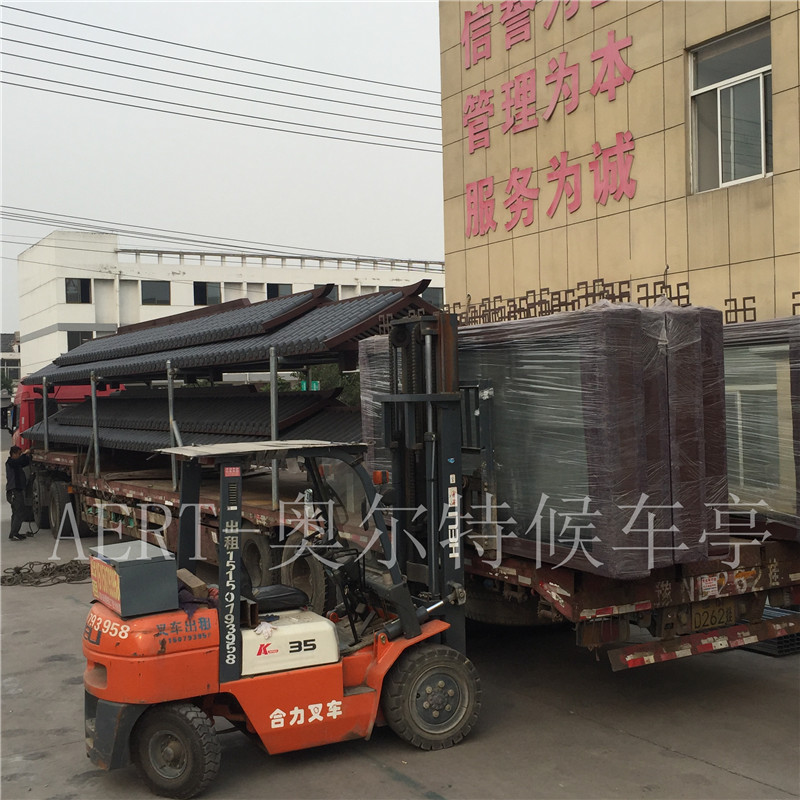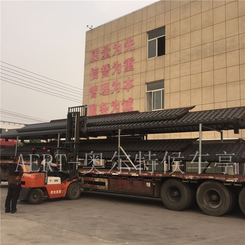 仿古候车亭和灯箱遮挡所需要的顶棚。针对雨、雪、冰雹、雷、风等比较恶劣的天气,顶棚可以为乘客提供遮挡的场所。