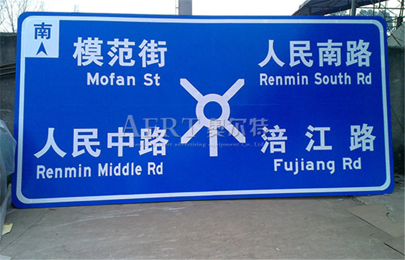 1、交通标志牌厂家生产的交通指路牌:通常为矩形,蓝(绿)底白字和白色图案。用于指示市镇村的境界,目的地的方向、距离,高速公路的出入口、服务区和著名地点所在等,并沿途进行各种导向。如国道编号、里程碑、百米桩、分界碑、指路牌、地名牌,以及高速公路出入口、加油站、修理站、停车场等的指示牌。辅助标志附加在主要标志上起补充说明作用。可分为表示车辆种类、表示时间、表示区间范围和表示距离等四种。辅助标志不能单独设立。