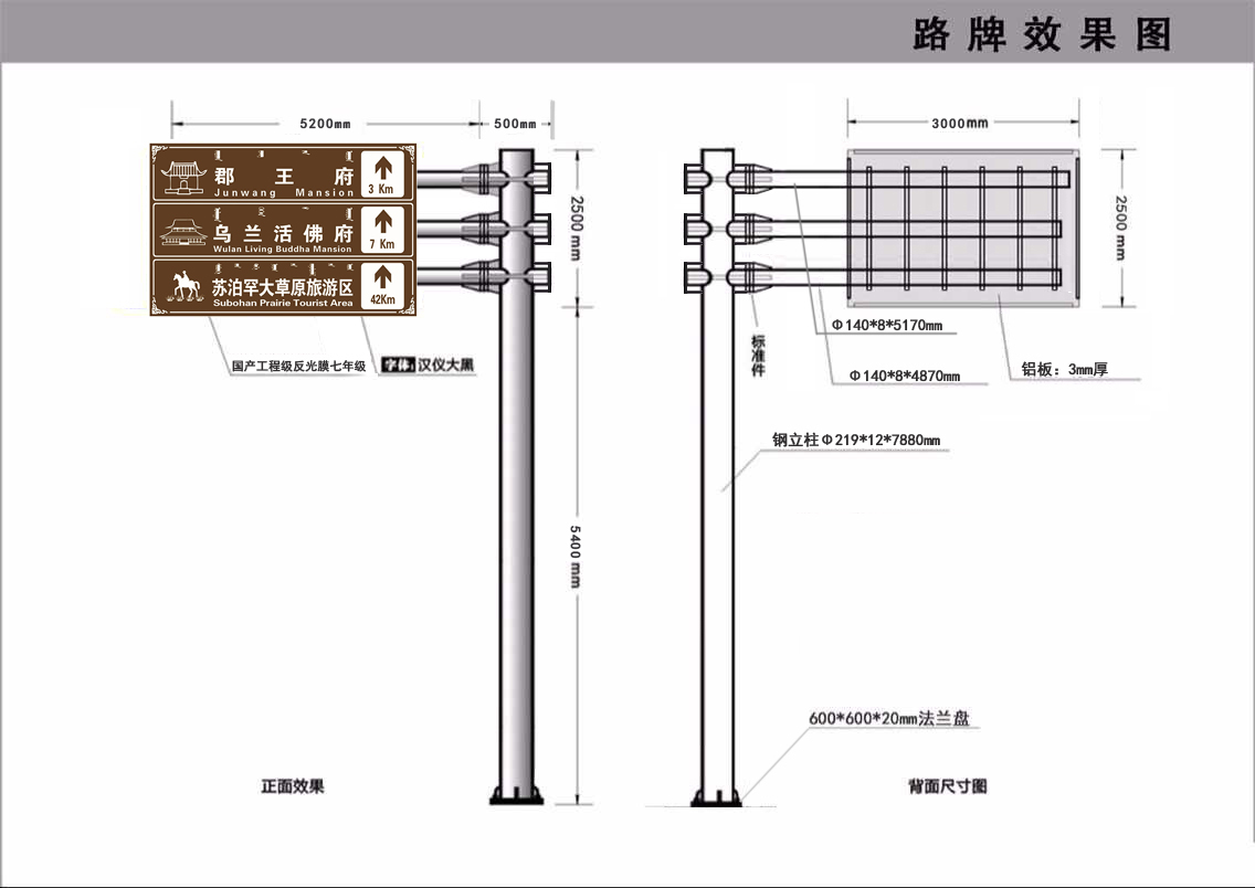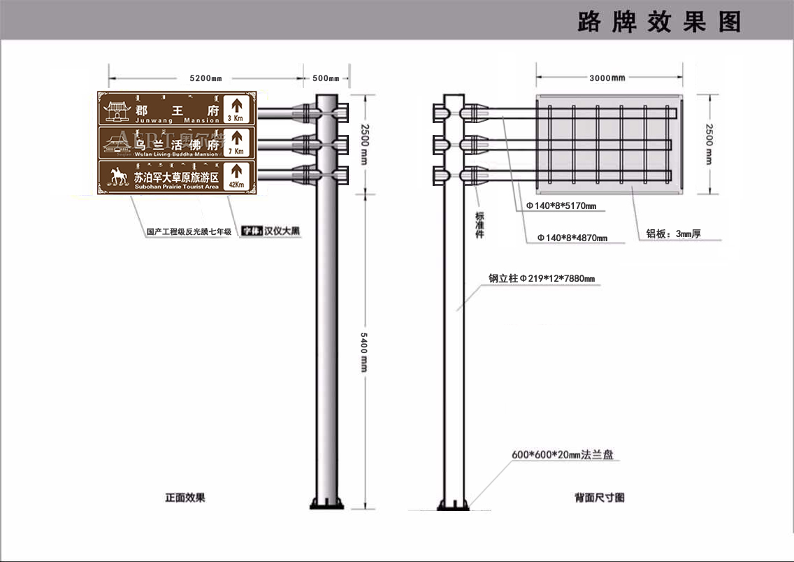 指引旅游景点指示牌常规尺寸:3米x1.5米,3米x2米,4米x2米,5米x2.5米等。